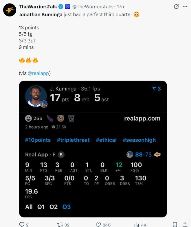 这场比赛的第叁节是乔纳森-库明加时间,他单节9分钟里,5中5+叁分3中3,拿到13分3篮板1抢断,命中率100%,叁分命中率100%,他帮助勇士一举拉开分差。